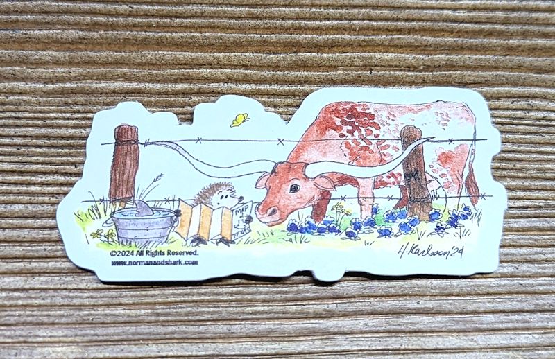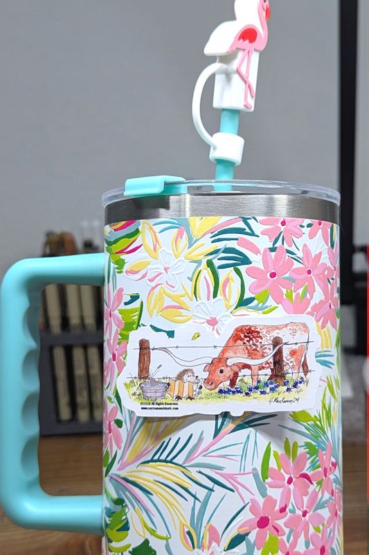 This three-inch sticker features artwork from an original painting I did last year called "Excuse me, ma'am...". The sticker is vinyl covered and waterproof, so you can put it on your water bottle, your laptop, or anywhere else stickers can be stuck. I only had twenty-five of these made, so once they're gone, they're gone for good! (Gaudy tumbler with straw and flamingo topper not included.)